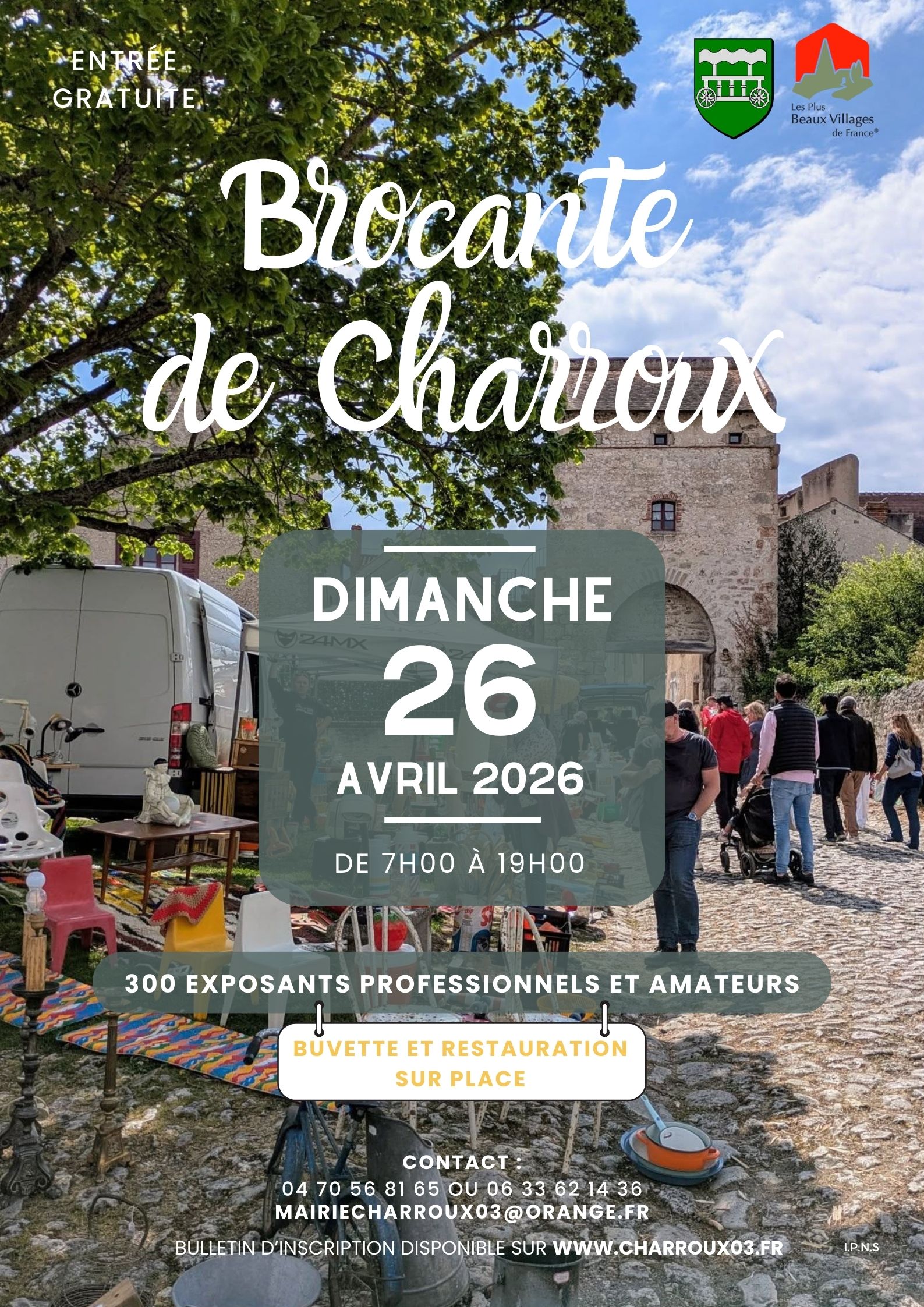 Pour vous inscrire à la foire à la Brocante de cette année, vous pouvez télécharger le bulletin d'inscription et le renvoyer compléter avec votre chèque de réglement à la mairie de Charroux, ou contacter le secrétariat